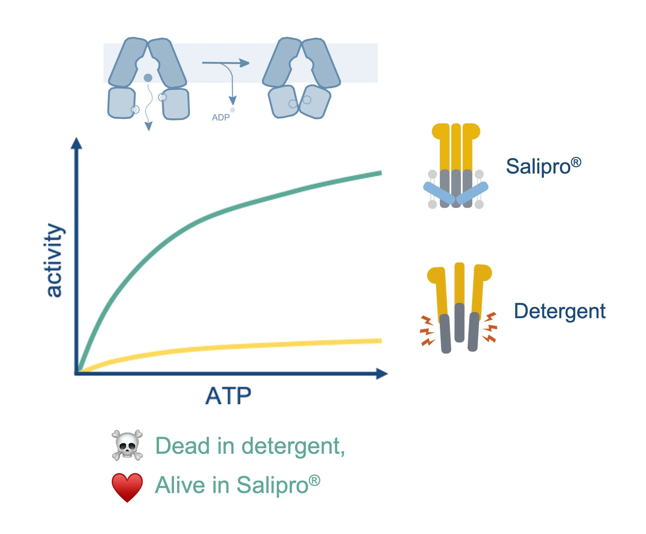In this study, the authors demonstrated how Salipro® nanoparticles prevent the functional suppression of ABC transporters caused by detergent micelles, enabling high-performance biochemical analysis of challenging membrane proteins.